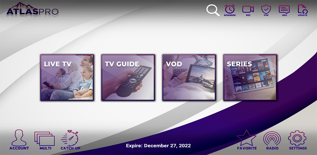 ATLAS PRO ONTV est une application de style de vie gratuite qui fera passer votre expérience de divertissement au niveau supérieur avec son interface intuitive et sa navigation facile. Une fois connecté, un écran d’accueil propre et convivial vous accueillera. Ici, les catégories de programmes – LIVE TV, VOD et Replay – sont affichées en évidence, ce qui vous permet de naviguer de manière transparente.